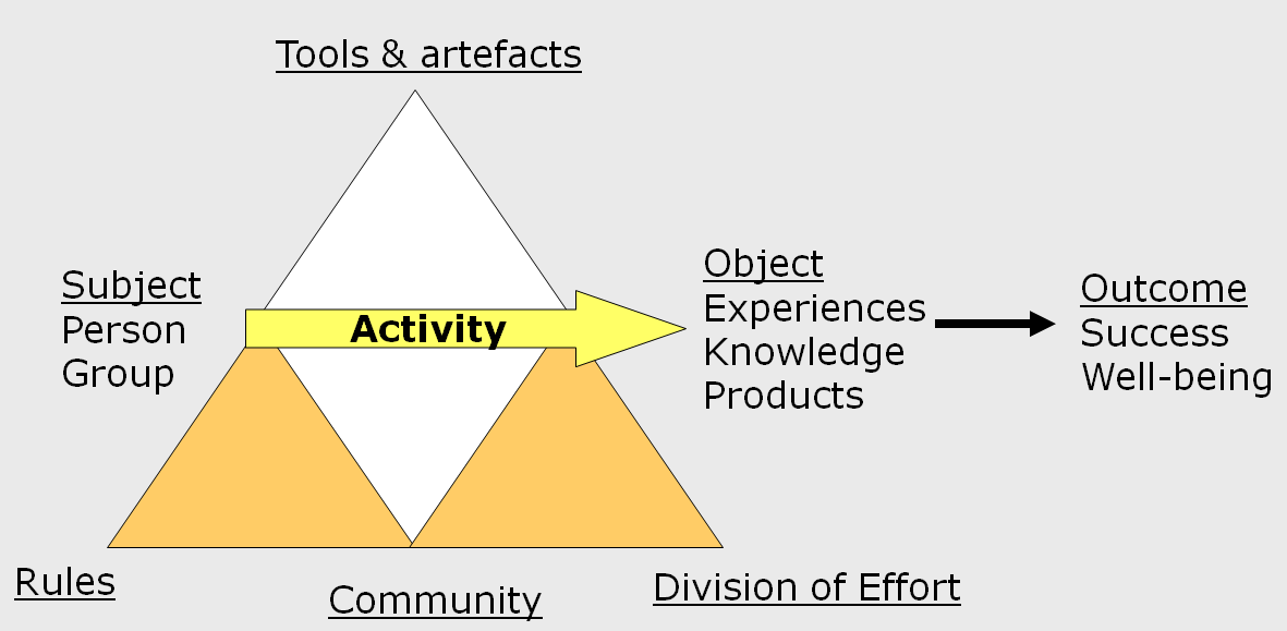 Activity Theory describes the theory that all human activities are driven by needs. These needs can be real or perceived. Activities can be undertaken by subjects (individuals and groups) or through objects. Tools are interfaces between subjects and objects. These carry on cultures and