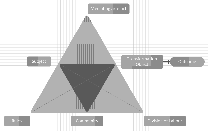 The relationship between subject and the community is mediated by rules. Rules cover both implicit and explicit norms, conventions and social relations within a community as related to the transformation process of the object into an outcome. Rules in our case consist of organizational practices and policies, working hours, working regulations, etc. The relationship between object and community is mediated by the division of labour: how the activity is distributed among the members of the community. That is, the role each individual in the community plays in the activity, the power each wields and the tasks each is held responsible for. Each of the mediating terms is historically formed and opens to further development. [3] The basic structure of an activity can be illustrated as in Figure 1.