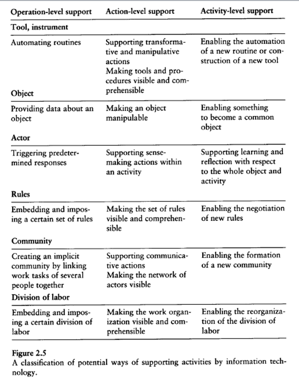“users” are individuals, with knowledge and practice habits gotten from membership in a community (or communities) of practice. “Activities” are object-centered and frequently social. Wikipedia quotes Nardi’s definition of AT: “all the mental functioning including remembering, deciding, classifying, generalising, abstracting and so forth, as a product of our social interactions with other people and of our use of tools” [4].