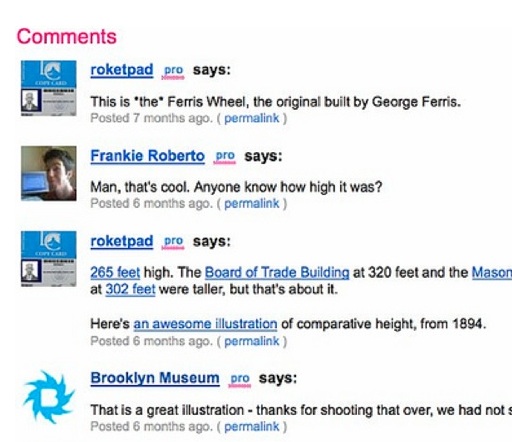 The time and space required to actually visit museums limits views and discussion of photos. Releasing the photos out into the world allows a much wider audience and appreciation. The library of congress recently released their photos of Flickr, and he Brookyln Museum has archives of uncopyrighted material with explanations of their sources. When museums began uploading photos to Flickr, patrons were able to access versions of the museum experience without having to be there. Often, visitors to the Flickr site would contribute vital historical information to the comments about historical photos. Without wider access to photos, that information may have been lost. Some sources were unknown, but Flickr users showed the way. They often added additional tags to photos and sorted them into specific groups. This brought another layer of history into circulation that might have otherwise been left in the back room of the library or museum in which they ended. Museum space is also limited, and using Flickr to showcase documents allows a museum to suddenly have much more space in the digital realm. Many historical photos have very high view counts, and comments also contain debates about what the photos include. The debates include people from many age groups and walks of life. People are able to meet around these photos and bring formerly auditory opinions into text. This is not to say that one should browse Flickr over visiting a museum, but that the medium of Flickr has extended the capabilities of museums, increasing accessibility. Flick users have become curators.